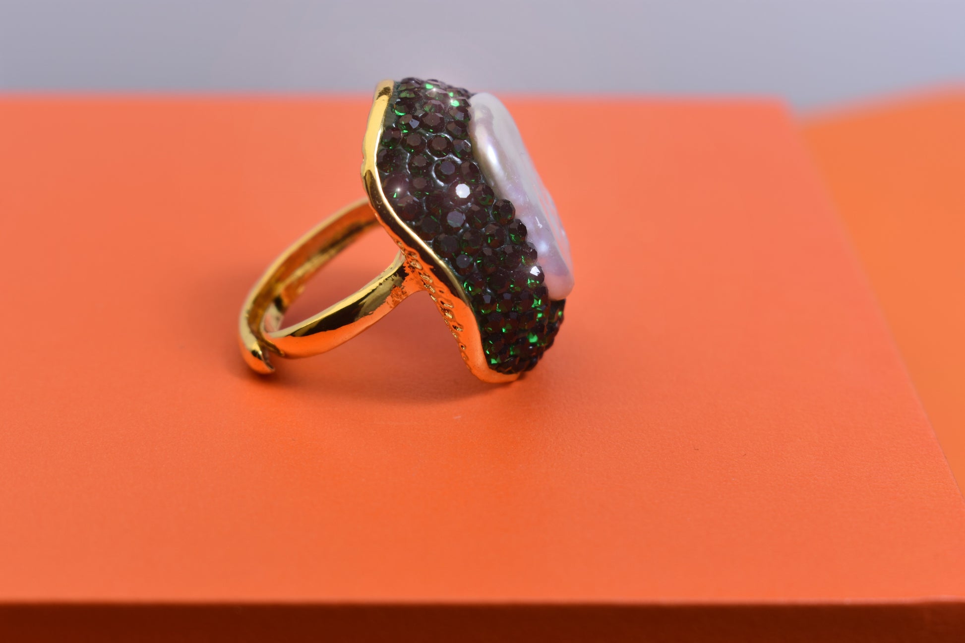 Luxurious and Shining Natural Baroque Pearl Ring with Three Dimensional Dense Inlaid Green Crystal Opening Adjustable Ring