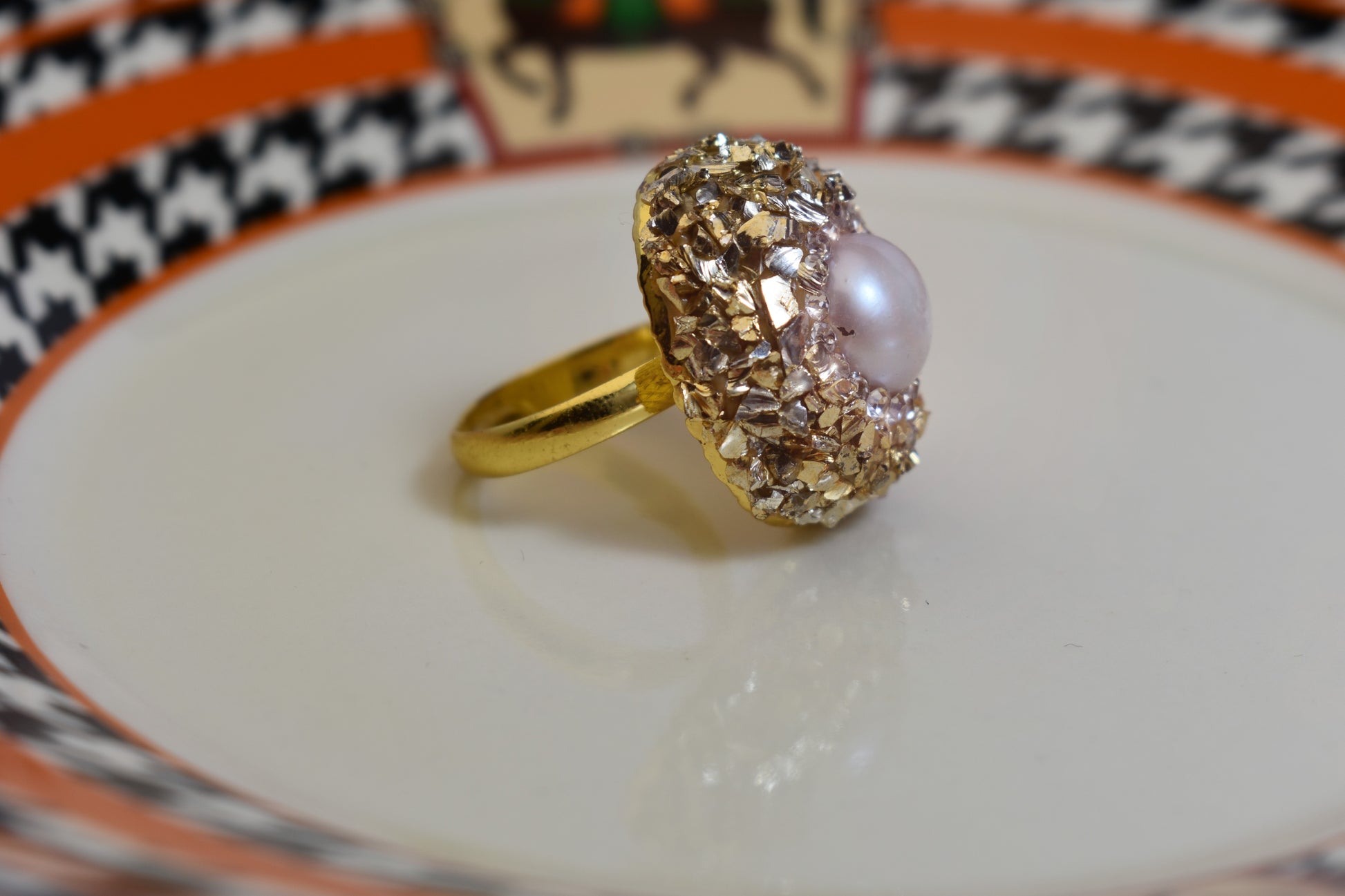 Luxurious shiny natural pearl ring with three-dimensional dense inlay of gold foil and crushed stone, adjustable ring at the opening
