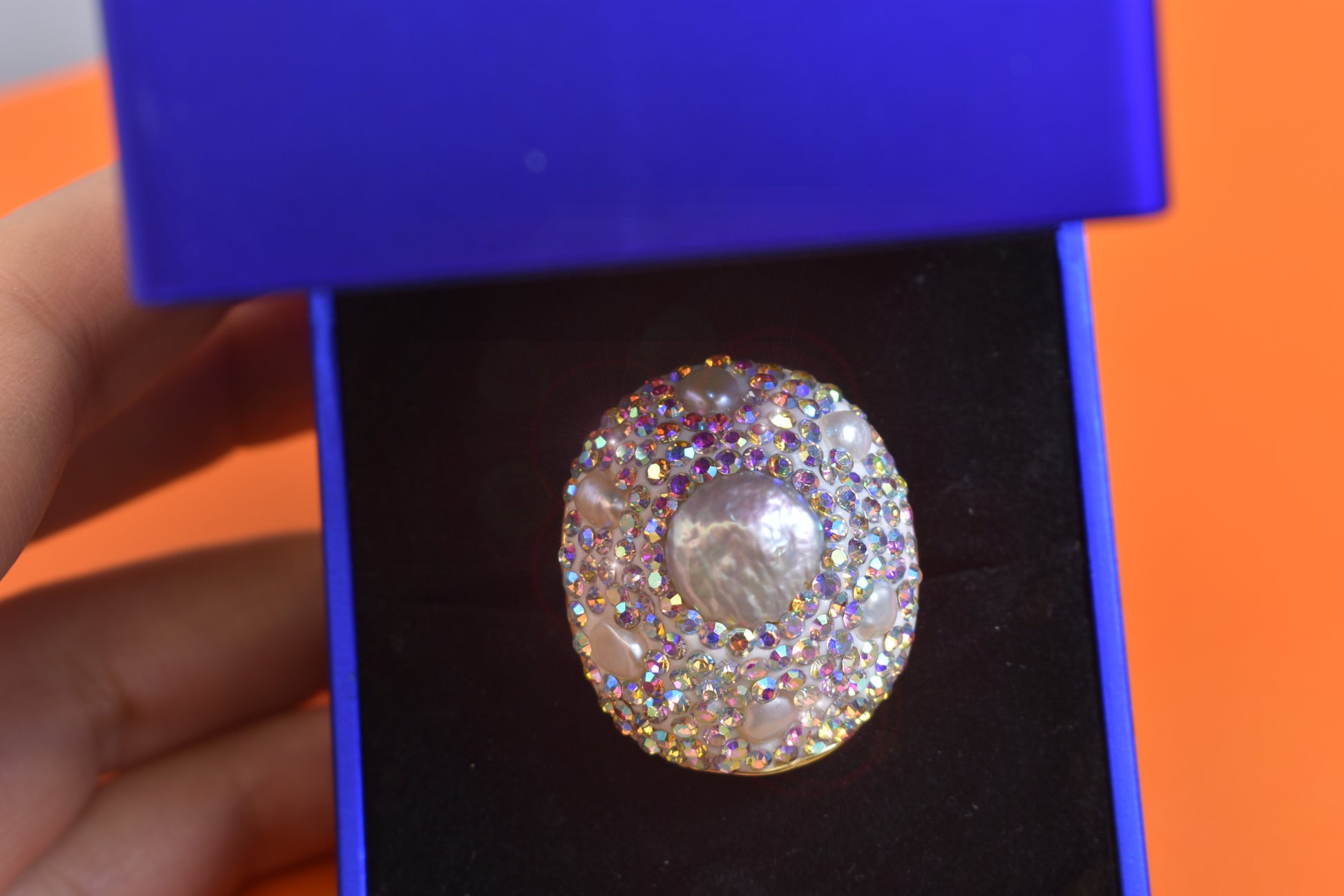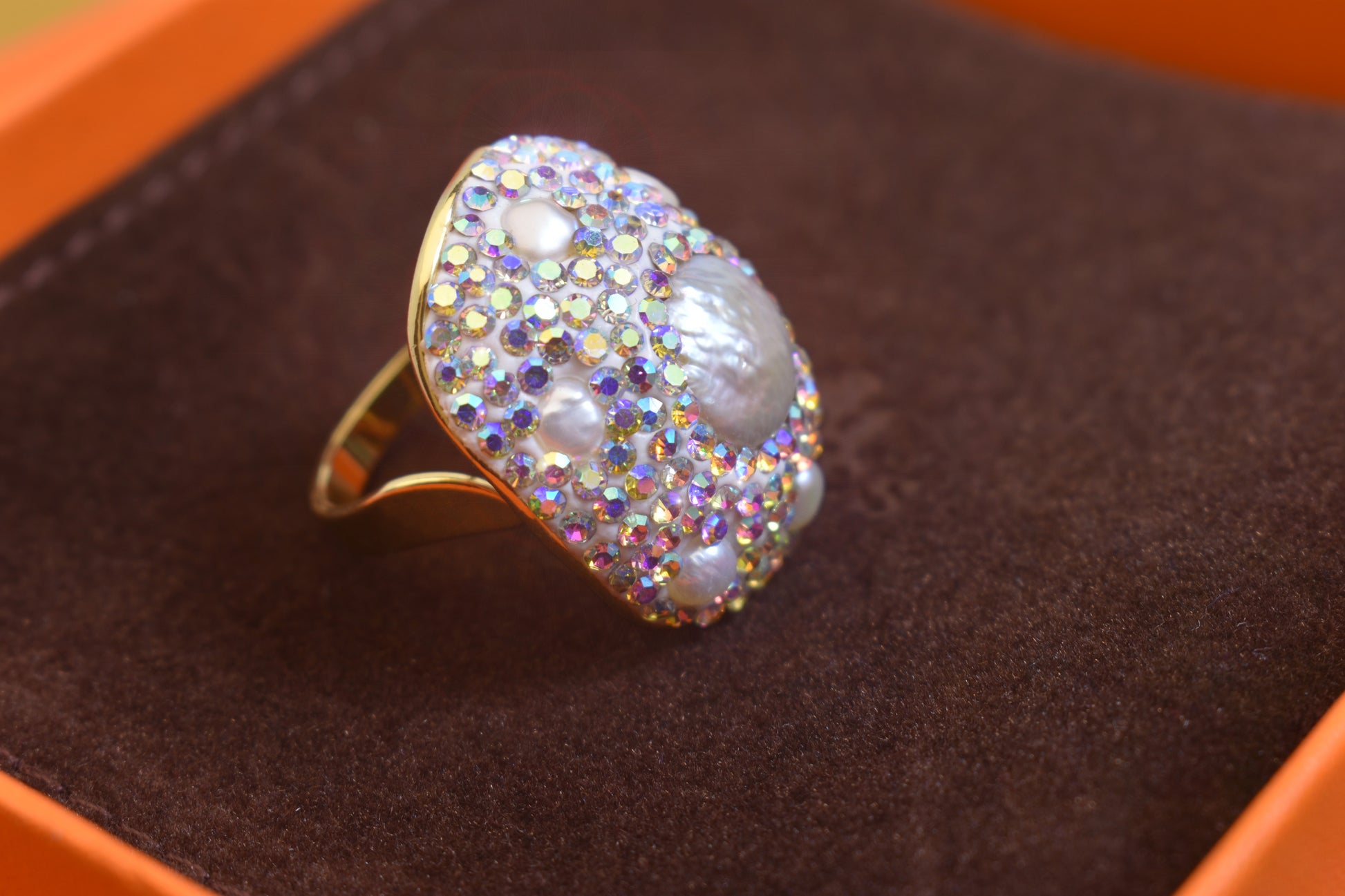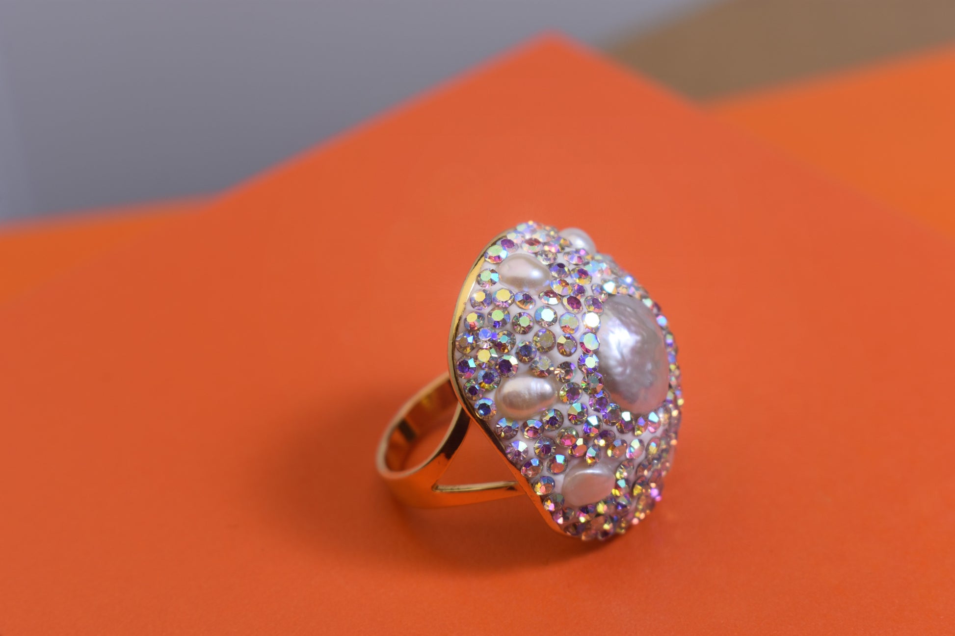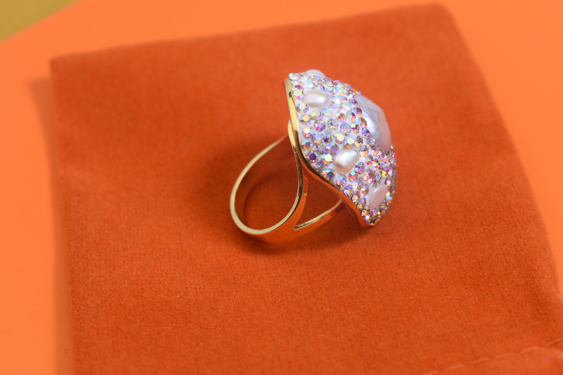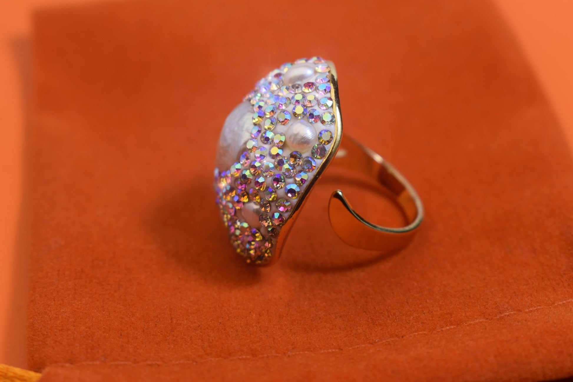 Luxurious and Shining Natural Baroque Pearl Ring with Three Dimensional Dense Embedding of Small Pearls and Colored Zirconia, Adjustable Ring at the Opening