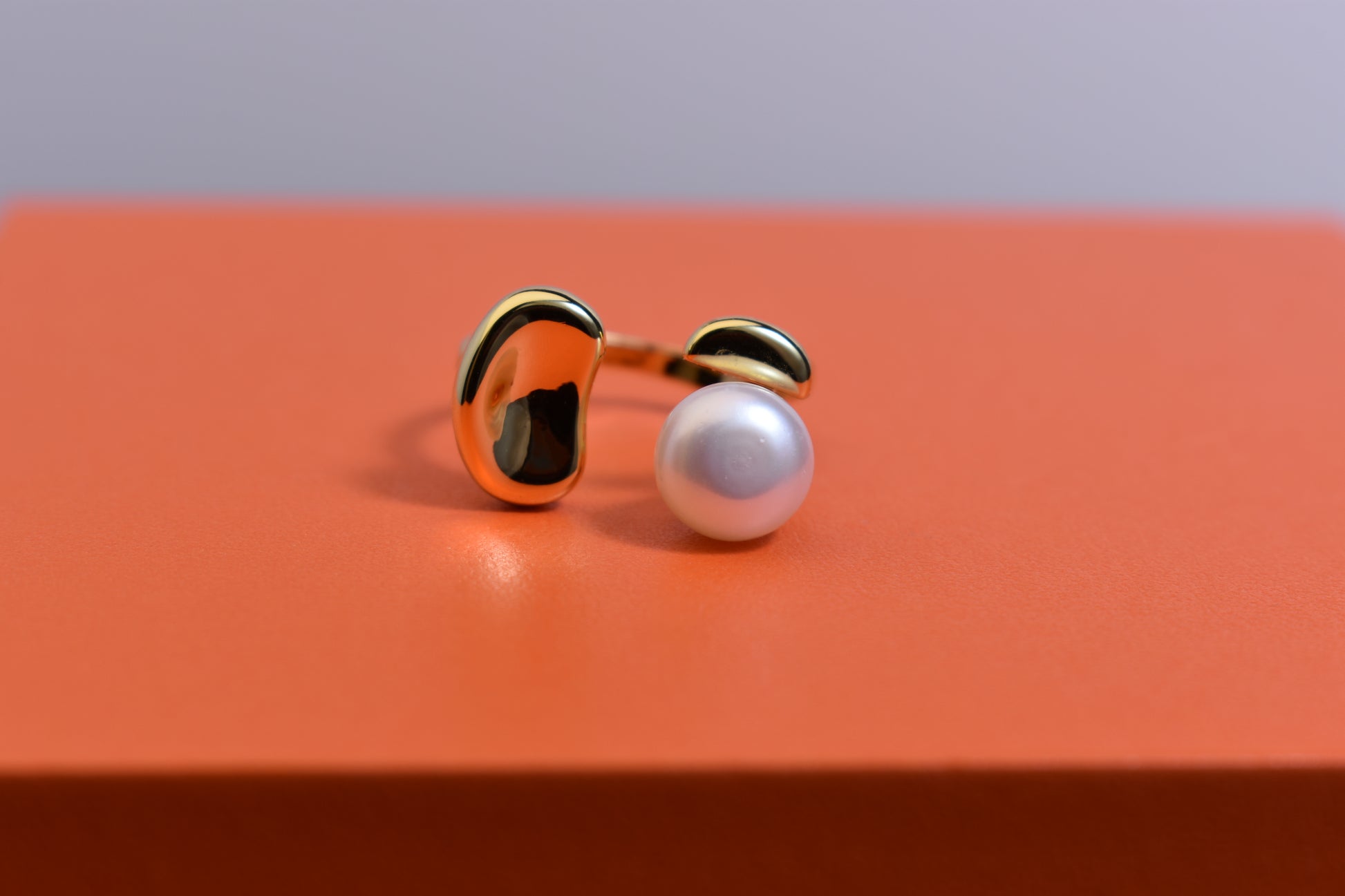 Natural pearl ring with gold size and double petal design with adjustable opening