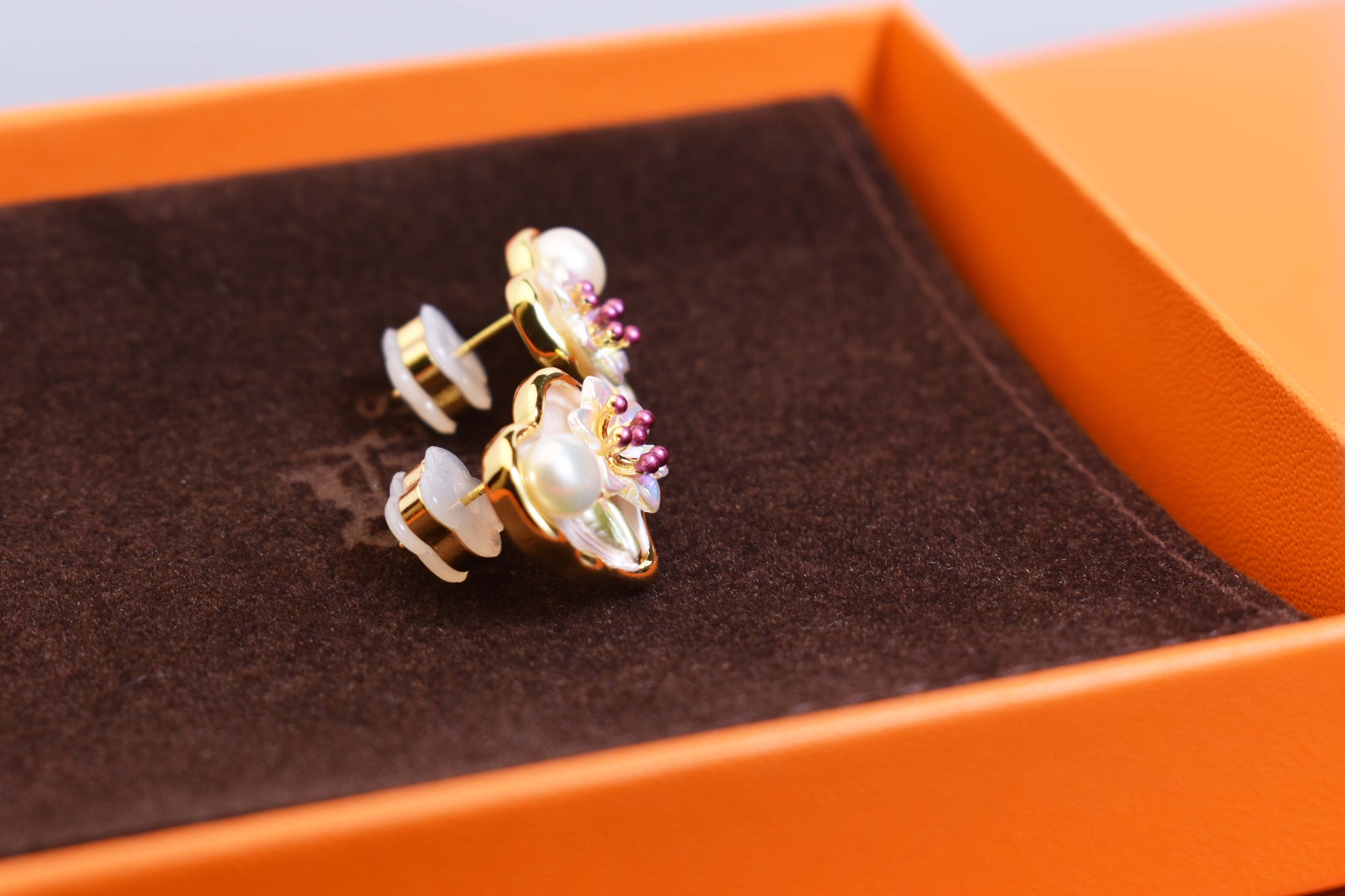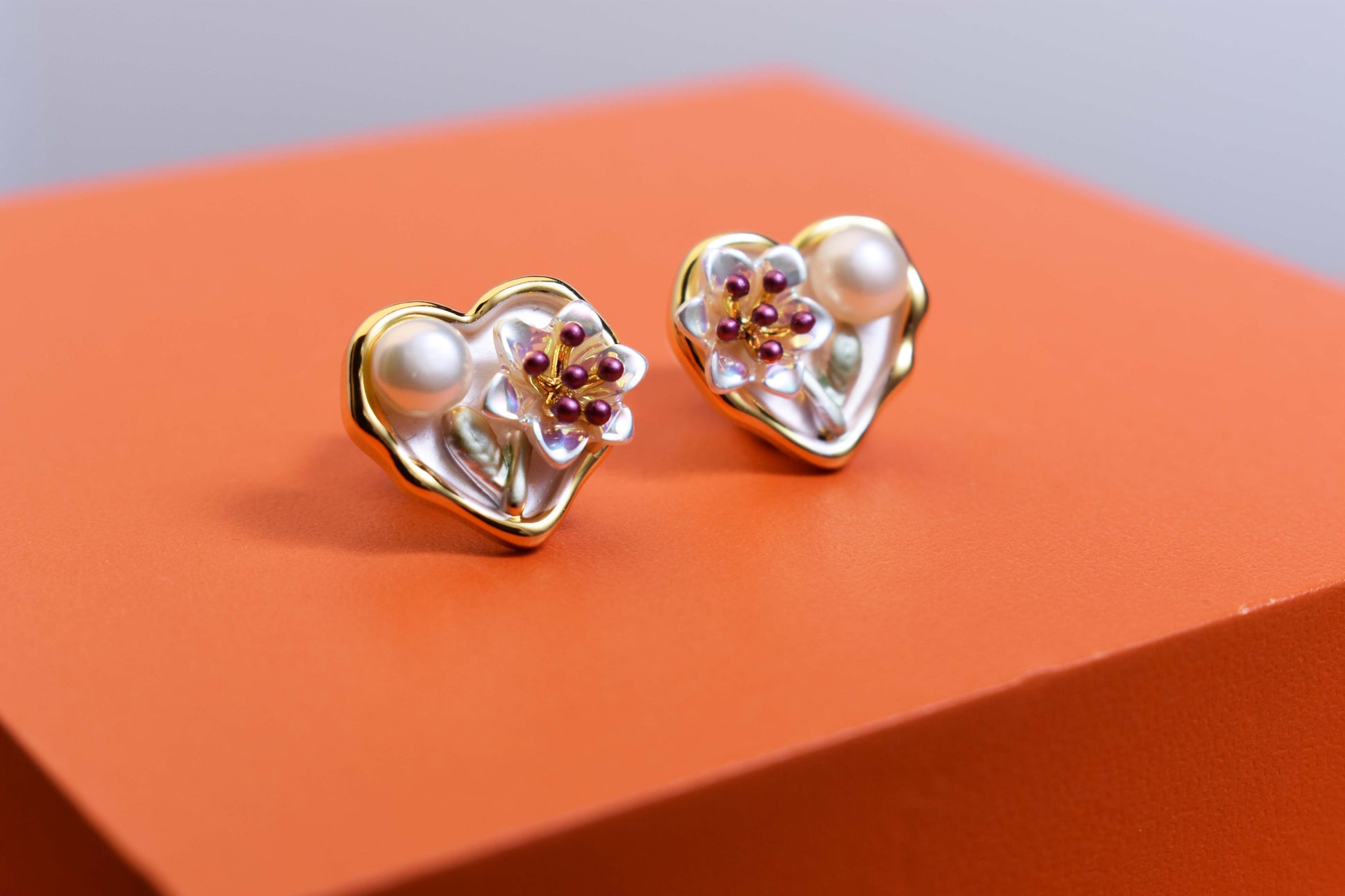 Natural pearl earrings with heart-shaped floral enamel craftsmanship earrings