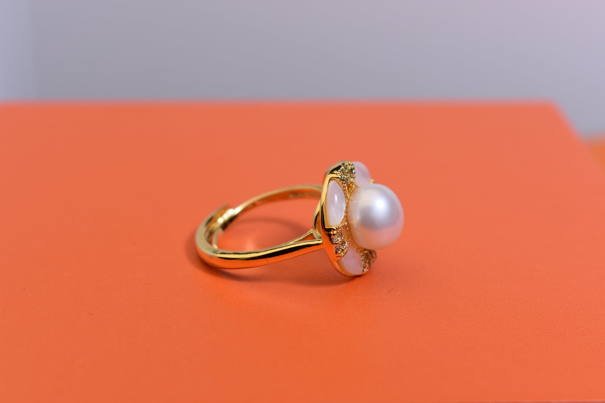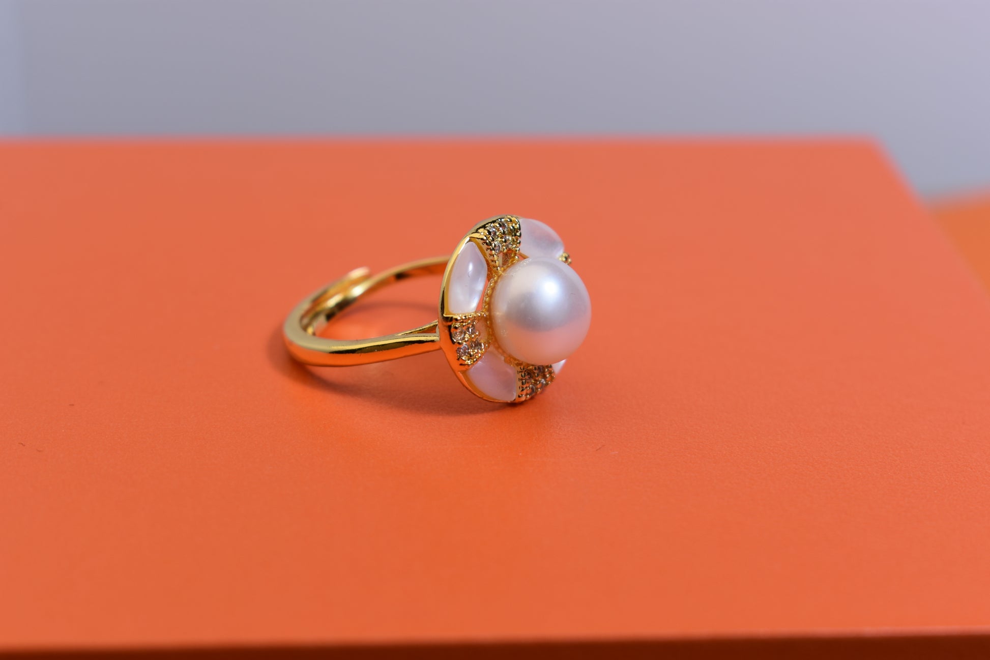 Natural pearl ring with white circular abalone shell surrounding the opening, adjustable ring