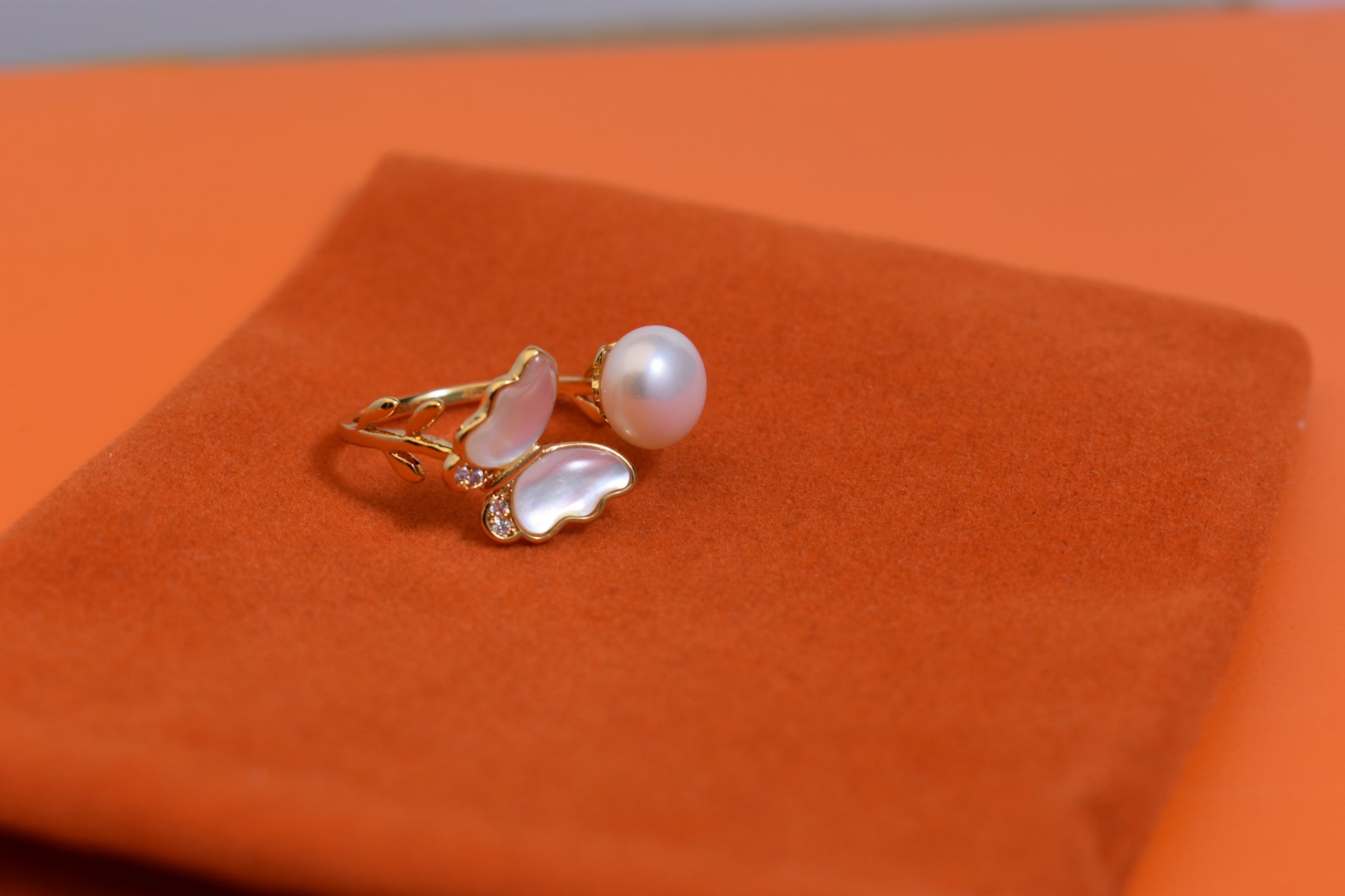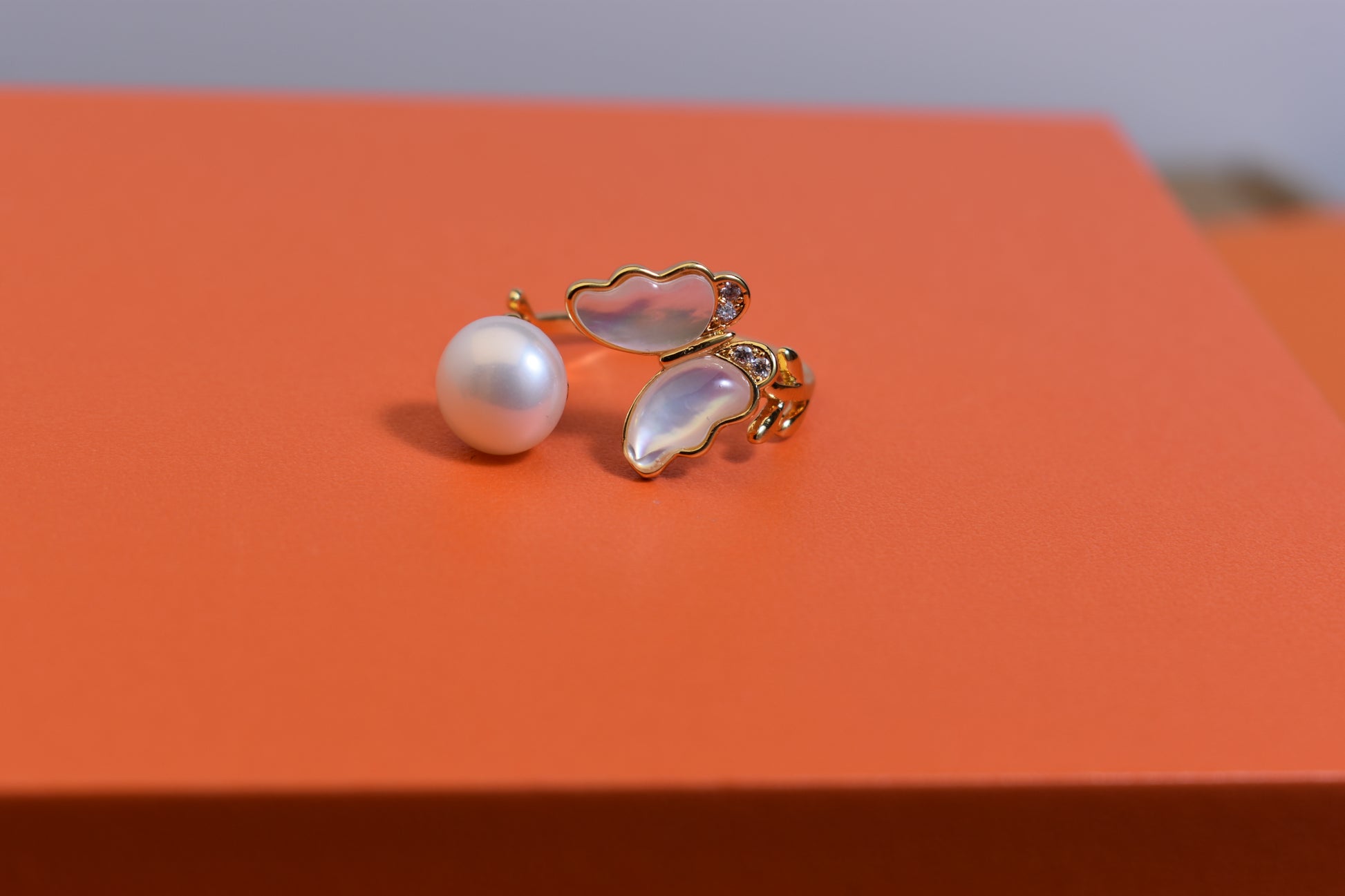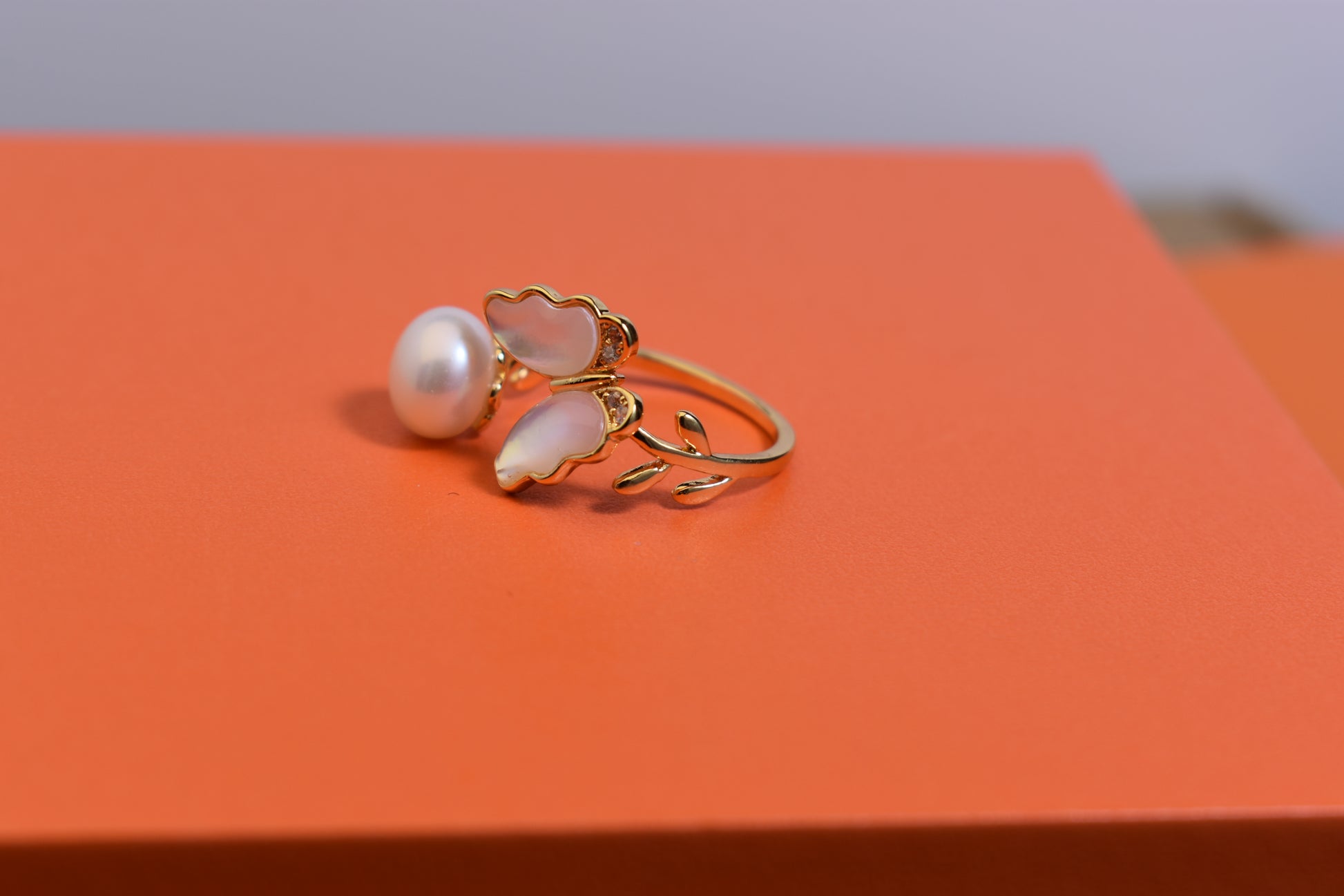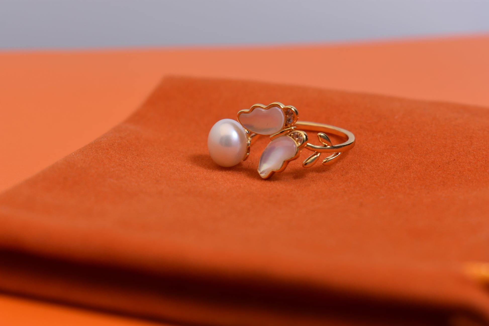 Natural pearl ring with white shell and butterfly shaped opening adjustable ring