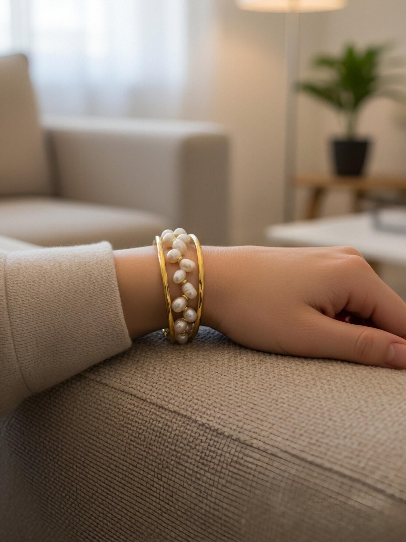 Natural Pearl Wheat Spike Style Three Set Smile Bracelet Gold Open Hammer Bracelet